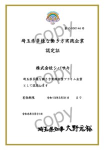 当社は、埼玉県が認定する「多様な働き方実践企業認定制度」において、